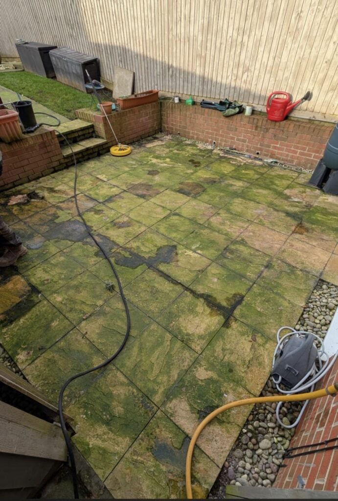 Patio covered in green algae, moss and surface staining, making the area look tired and slippery.